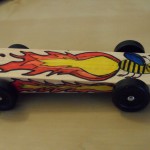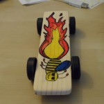 This week for cub scouts we had our pinewood derby contest. We combined with another troop/ward so we could actually have a “real” contest. They served popcorn and lemonade at the race,but we didn’t eat any because the kids got into it before we could. Afterwards, the leaders got to do a race. This was our car. Mark and I bought the wedge and wheels at the scout shop. Then, Mark sanded the wedge down until it was nice and smooth. I used a pen and markers to color the flaming bee and side flames. Finally, Mark put in the wheels by pushing in the nails. It was tough work! We were going to sand the nails, but we didn’t have enough time. I think our car was by far the most colorful car around. I gave it the best looking car award, but we lost the race. Now we know what to do so that we can “win” next time.